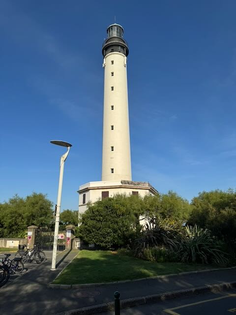 Our first stop was the farthest point of the day’s journey, the Phare de Biarritz (“phare” means “lighthouse”), from which we were able to look back at Biarritz before we visited it. Wikipedia describes the town as “a luxurious seaside tourist destination known for the Hôtel du Palais (originally built for the Empress Eugénie c. 1855), its seafront casinos, and its surfing culture.”