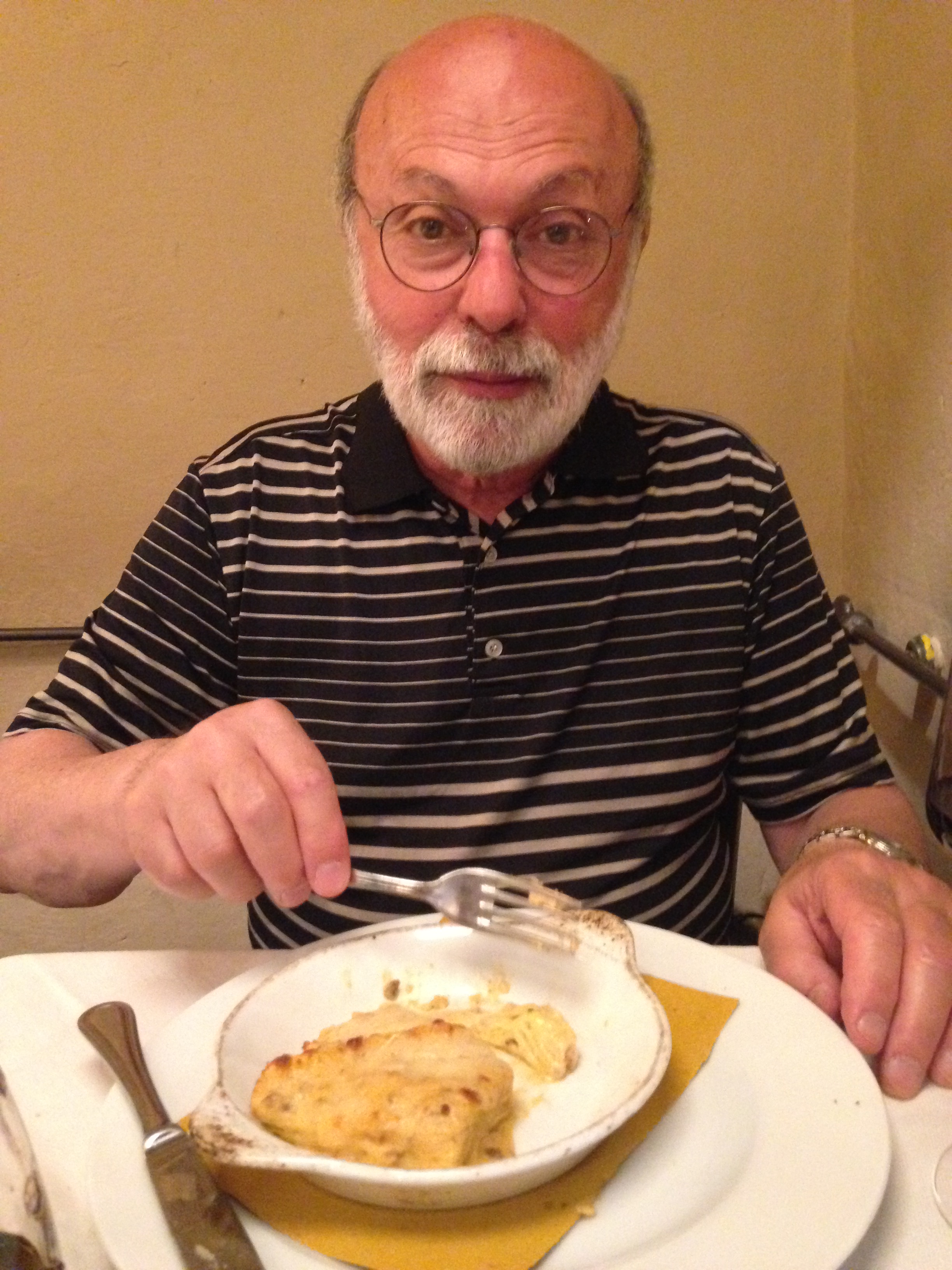 We had tried without success on our first night back in Venice to get a table at the Andri Fish and Seafood restaurant on Lido, so we’d made a reservation for our last night in Italy. It was a perfect choice. The seafood was outstanding, and Arnie took a great interest in the grappa — they just put a full bottle of the powerful fruit and booze concoction down on each table with the dessert menu and let the guests go at it. Different fruit for different tables. (Ours was full of mandarins.) No charge. I doubt that anyone but the non-drinkers walked out of that place steadily. As well as watching Arnie’s enjoyment of the drink, I was intrigued by what it did to a couple sitting across from us on the patio who seemed to have barely known one another when they arrived.